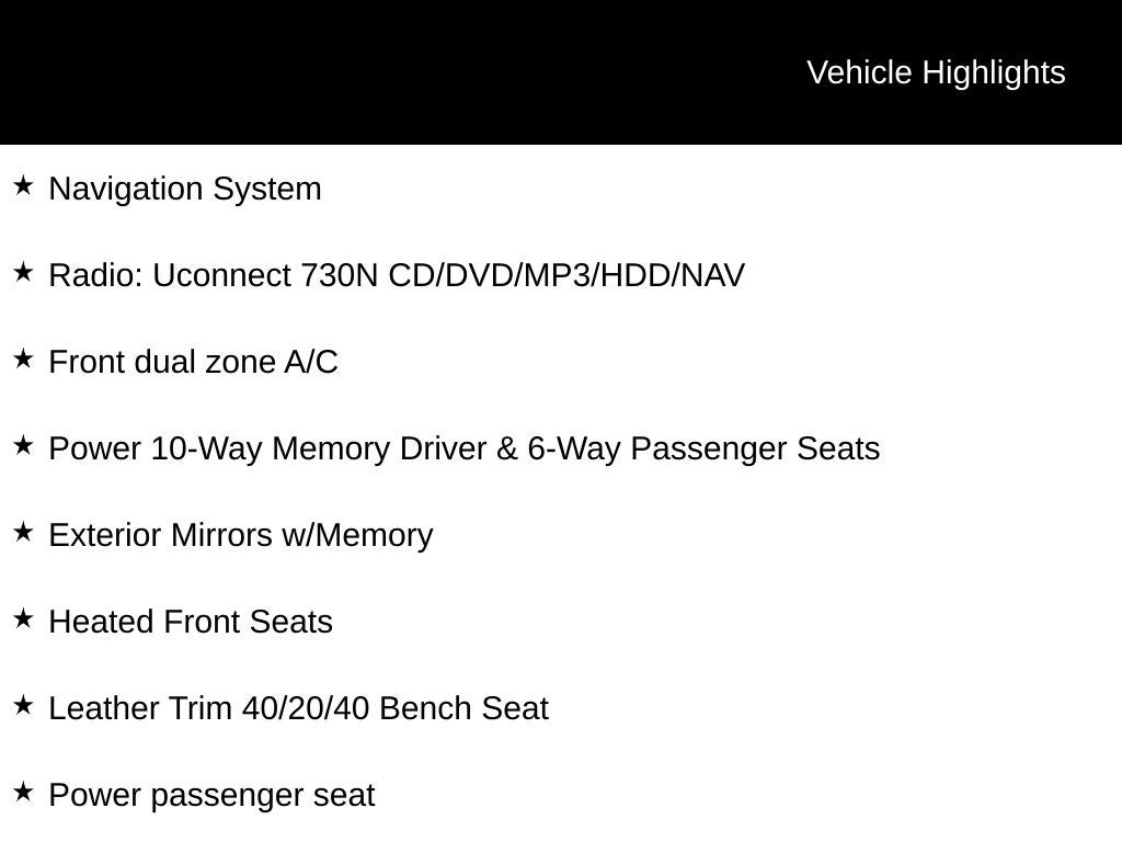 - Uconnect 730N -inc: AM/FM stereo w/CD/DVD/MP3 player, USB port, 40GB hard drive w/20GB available, 6.5" touch screen, GPS navigation, SiriusXM traffic w/1-year service, SiriusXM travel link w/1-year service, ParkView rear back-up camera