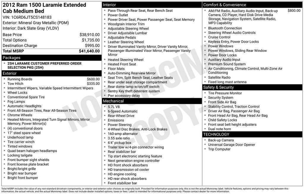 2012 Ram 1500 Mineral Gray Metallic Clearcoat Laramie RWD 6-Speed Automatic HEMI 5.7L V8 Multi Displacement VVT 20 x 9 Chrome Clad Aluminum Wheels, Exterior Mirrors w/Memory, Front dual zone A/C, Heated Front Seats, Leather Trim 40/20/40 Bench Seat, Navigation System, Power 10-Way Memory Driver & 6-Way Passenger Seats, Power passenger seat, Radio: Uconnect 730N CD/DVD/MP3/HDD/NAV.