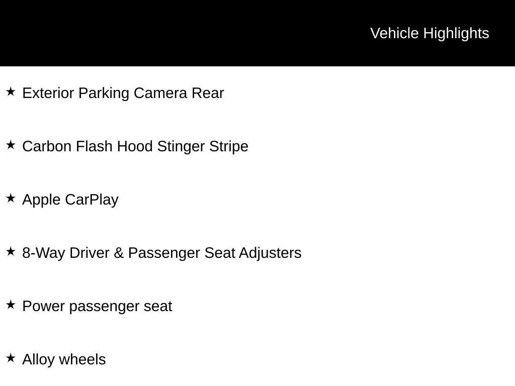 2016 Chevrolet Corvette Black Stingray Z51 1LT RWD 8 Speed Paddle Shift with Automatic Modes 6.2L V8 8-Way Driver & Passenger Seat Adjusters, Alloy wheels, Apple CarPlay, Bose Premium 9-Speaker Audio System Feature, Carbon Flash Badge Package, Carbon Flash Hood Stinger Stripe, Exterior Parking Camera Rear, Front dual zone A/C, Painted Body-Color Carbon Fiber Removable Roof Panel, Power driver seat, Power passenger seat, Preferred Equipment Group 1LT, Remote Vehicle Starter System, Steering wheel mounted audio controls.