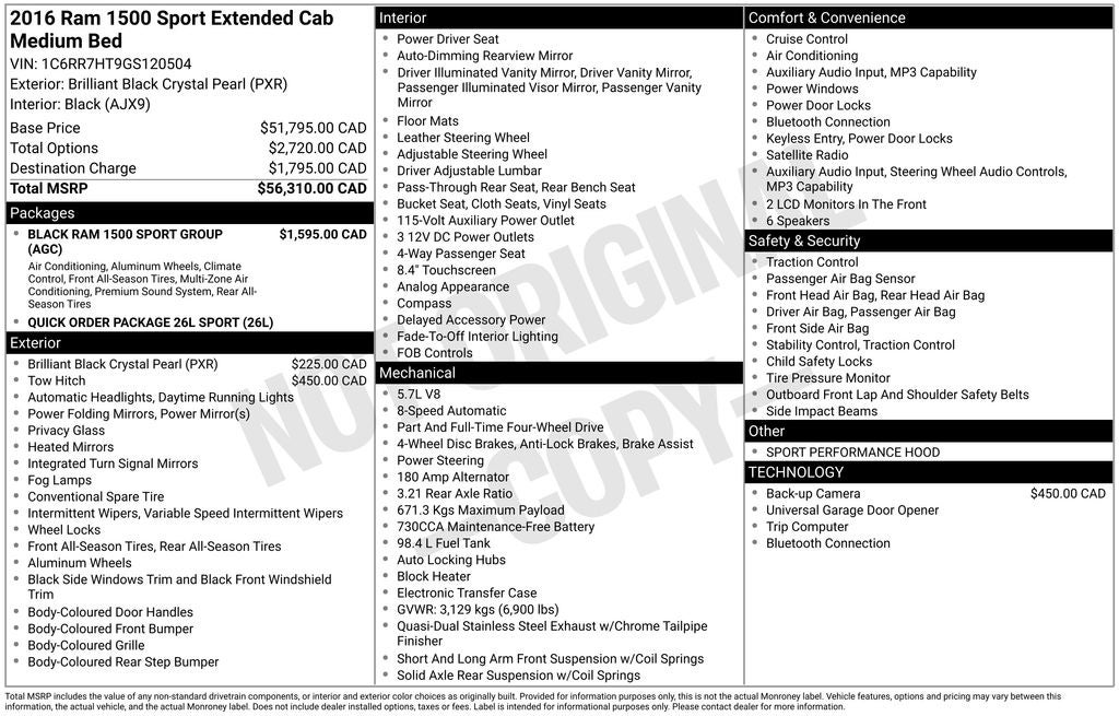 2016 Ram 1500 Brilliant Black Crystal Pearlcoat Sport 4WD 8-Speed Automatic HEMI 5.7L V8 Multi Displacement VVT 4x4 Flat Black Badge, 9 Alpine Speakers w/Subwoofer, Air Conditioning ATC w/Dual Zone Control, Bi-Function Halogen Projector Headlamps, Black Ram 1500 Sport Group, Black Ram Head Tailgate Badge, Black Tubular Side Steps, Body Color/Bright Billets Grille, Cloth Bucket Seats, Flat Black 5.7L Hemi Badge, Flat Black Ram 1500 Badge, Front dual zone A/C, Front fog lights, Heated Front Seats, Media Hub (SD, USB, AUX), ParkView Rear Back-Up Camera, Power driver seat, Radio: Uconnect 8.4, SIRIUSXM Satellite Radio, Speed control, Sport Performance Hood, Turn signal indicator mirrors, Uconnect Access, Wheels: 20 x 9 Semi-Gloss Black Aluminum.
