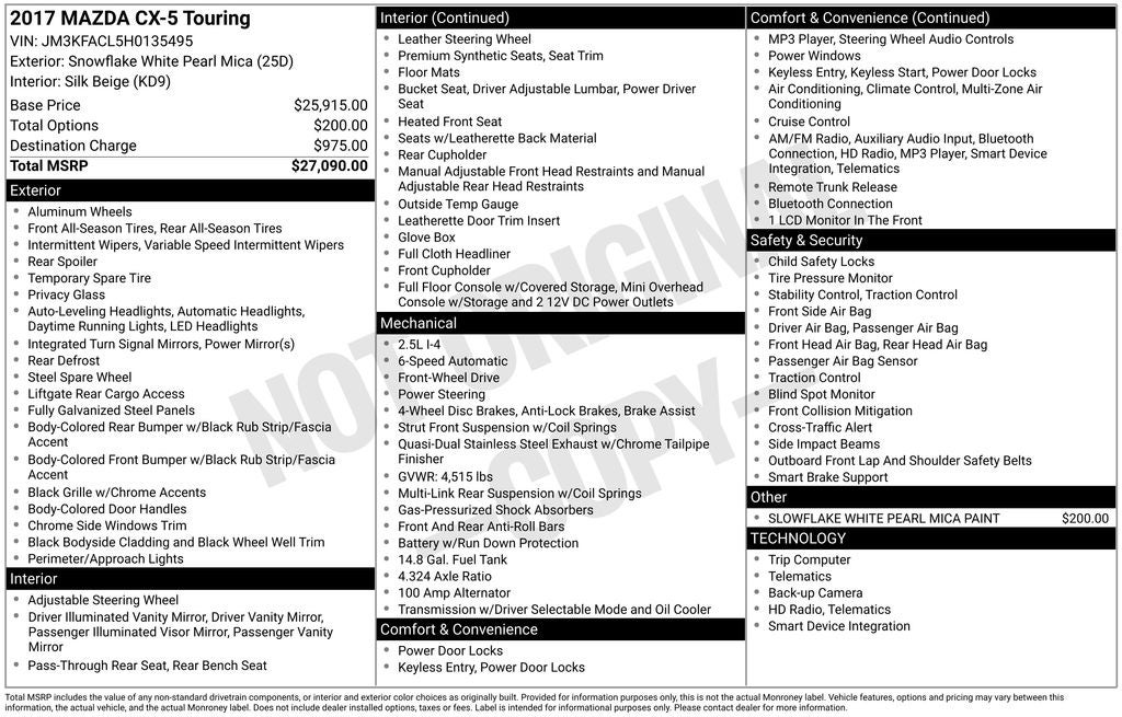2017 Mazda CX-5 Snowflake White Pearl Mica Touring FWD 6-Speed Automatic SKYACTIV® 2.5L 4-Cylinder DOHC 16V 17 x 7J Aluminum Alloy Wheels, 6 Speakers, Air Conditioning, AM/FM radio, Delay-off headlights, Emergency communication system, Front Bucket Seats, Front dual zone A/C, Heated front seats, Leatherette Seat Trim, Low tire pressure warning, Outside temperature display, Power driver seat, Radio: AM/FM/HD Audio System w/6 Speakers, Remote keyless entry, Slowflake White Pearl Mica Paint, Speed control, Turn signal indicator mirrors.