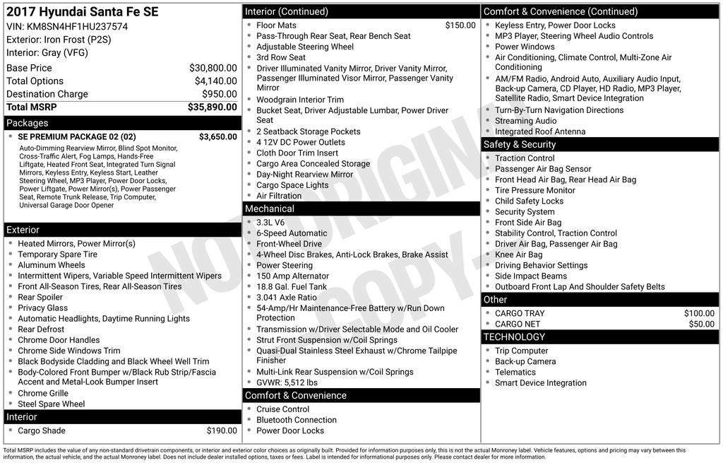 Boasting a powerful 3.3L V6 engine and a smooth 6-speed automatic transmission, this Santa Fe delivers an impressive blend of performance and efficiency, with an EPA-estimated 18 MPG in the city and 25 MPG on the highway. The sleek Gray exterior and well-appointed interior create a refined and sophisticated presence, while the comprehensive suite of advanced safety and convenience features ensures a secure and comfortable ride.