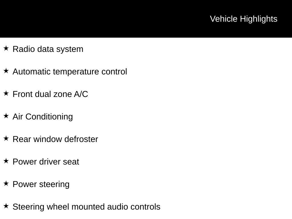 - Radio w/Seek-Scan, MP3 Player, Clock, Speed Compensated Volume Control, Steering Wheel Controls, Voice Activation and Radio Data System