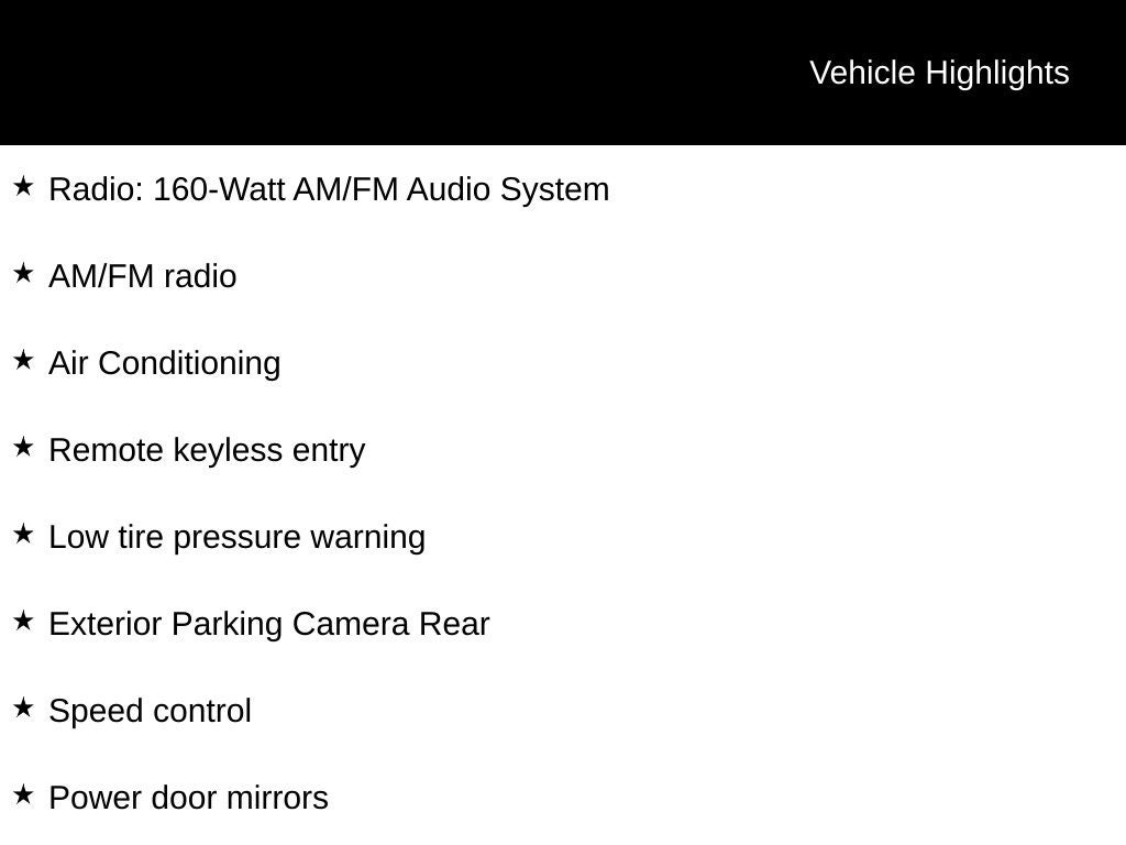 - Radio: 160-Watt AM/FM Audio System -inc: 4 speakers, 5-inch color LCD screen, Bluetooth® HandsFreeLink, Bluetooth® streaming audio, radio data system (RDS), speed-sensitive volume control (SVC), 1.0-amp USB audio interface port in front, illuminated steering wheel-mounted audio controls and integrated rear-window antenna