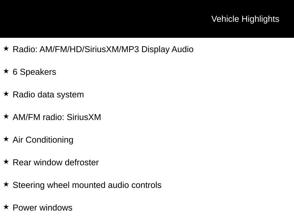 - Radio w/Seek-Scan, Clock, Speed Compensated Volume Control, Steering Wheel Controls, Voice Activation and Radio Data System