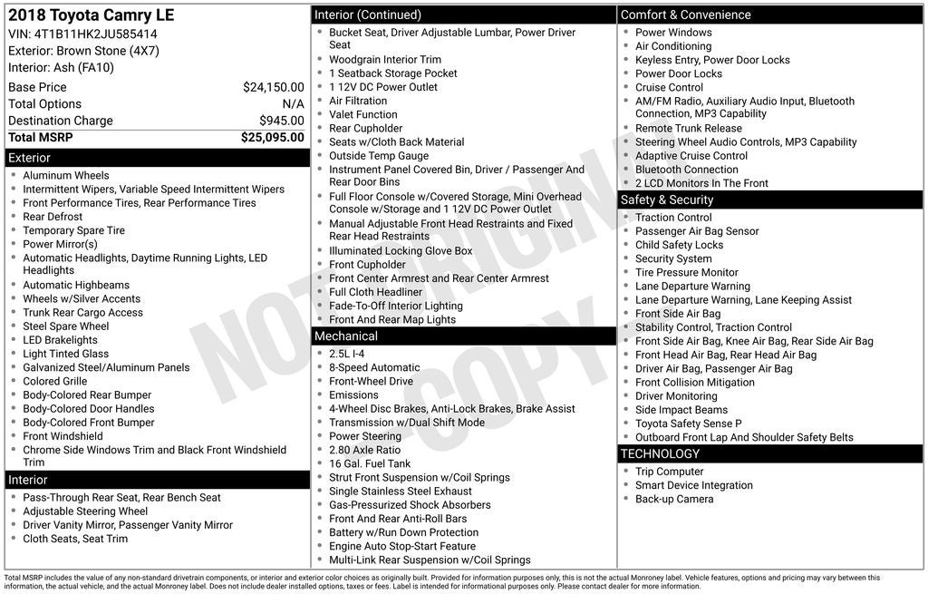 2018 Toyota Camry Brown Stone LE FWD 8-Speed Automatic 2.5L I4 DOHC 16V Ash w/Perforated Leather Seat Trim, ABS brakes, Active Cruise Control, Air Conditioning, Alloy wheels, Electronic Stability Control, Exterior Parking Camera Rear, Fabric Seat Trim, Illuminated entry, Low tire pressure warning, Power driver seat, Radio: Entune 3.0 Audio, Remote keyless entry, Traction control.