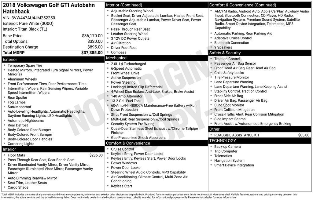 Pure White 2018 Volkswagen Golf GTI Autobahn FWD 6-Speed DSG Automatic with Tiptronic 2.0L TSI Alloy wheels, Exterior Parking Camera Rear, Front dual zone A/C, Heated front seats, Navigation System, Power driver seat, Power moonroof, Radio: Discover Media w/8 Touchscreen Navigation.