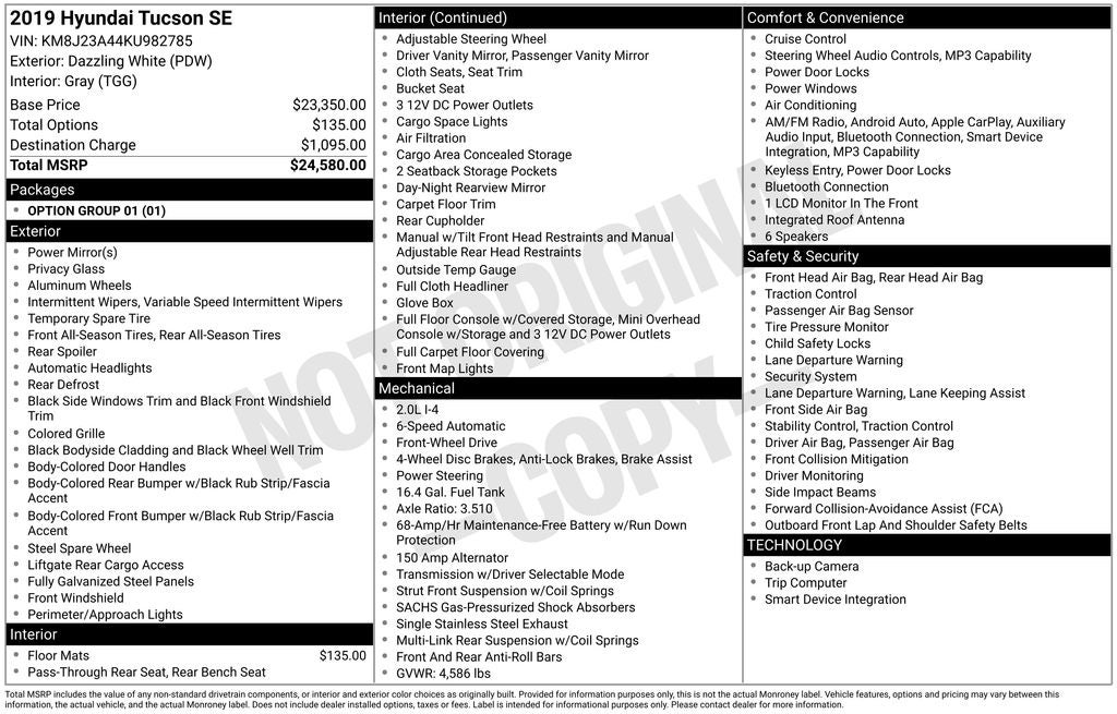 Dazzling White 2019 Hyundai Tucson SE FWD 6-Speed Automatic with Shiftronic I4 17 x 7.0J Alloy Wheels, Air Conditioning, Apple CarPlay & Android Auto, Exterior Parking Camera Rear, Front Bucket Seats, Outside temperature display, Radio: AM/FM Audio System, Remote keyless entry, YES Essentials Cloth Seat Trim.