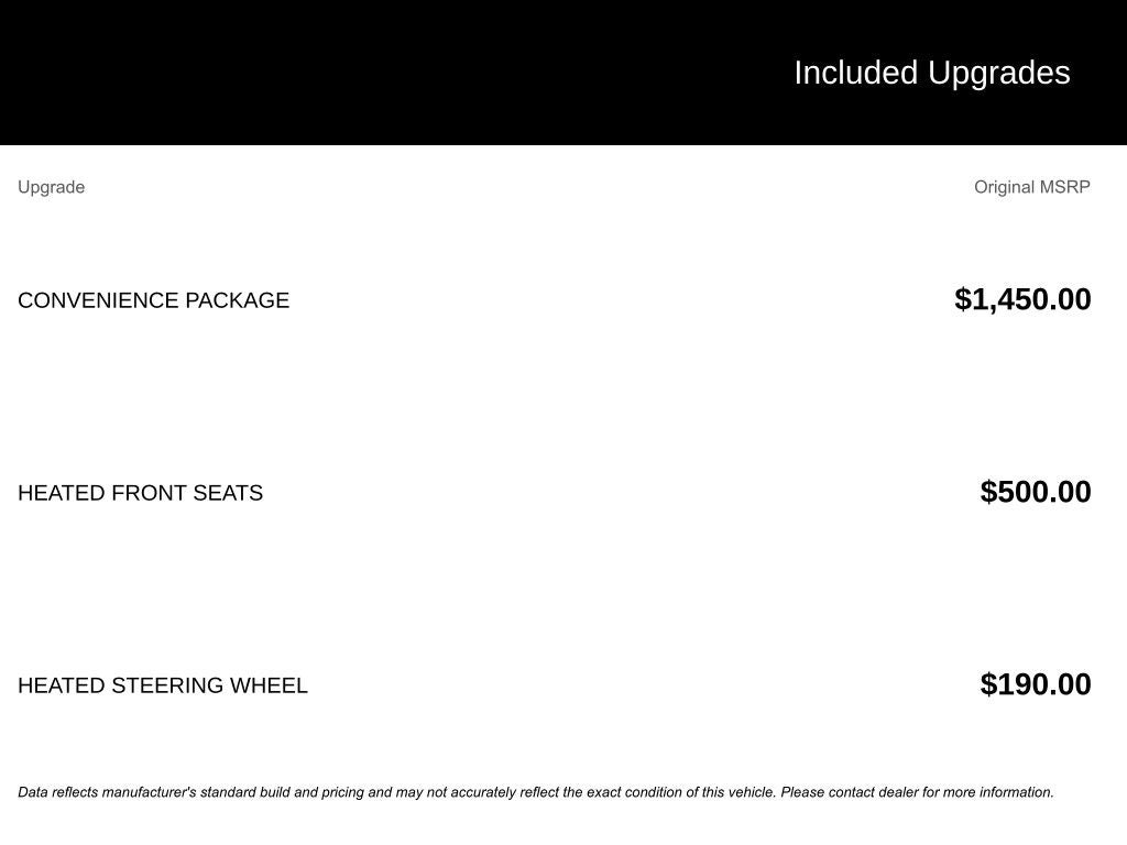 - Convenience Package: Includes Comfort Access Keyless Entry, Lumbar Support, Rear View Camera, SiriusXM Satellite Radio, 1 year All Access subscription, Active Driving Assistant, and Parking Assistant