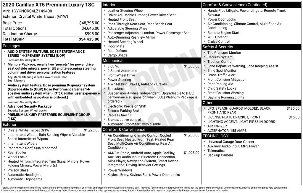 2020 Cadillac XT5 Crystal White Tricoat Premium Luxury FWD 9-Speed Automatic 3.6L V6 DI VVT 2-Way Power Driver Lumbar Control Seat Adjuster, 2-Way Power Passenger Lumbar Control Seat Adjuster, Air Conditioning, Apple CarPlay/Android Auto, Automatic Dual-Zone Climate Control, Bose Performance Series 14 Speakers System, Bose Premium 8-Speaker Audio System Feature, Exterior Parking Camera Rear, Front & Rear Park Assist, Heated Driver & Front Passenger Seats, Leather Seating Surfaces w/Mini Perforated Inserts, Light Pipes in Doors Lighting Accent, Memory seat, Power driver seat, Power Liftgate, Power moonroof: UltraView, Radio: Cadillac User Experience AM/FM Stereo, Radio: Cadillac User Experience w/Embedded Nav, SiriusXM w/360L, Wheels: 18 6-Split Spoke Alloy.
