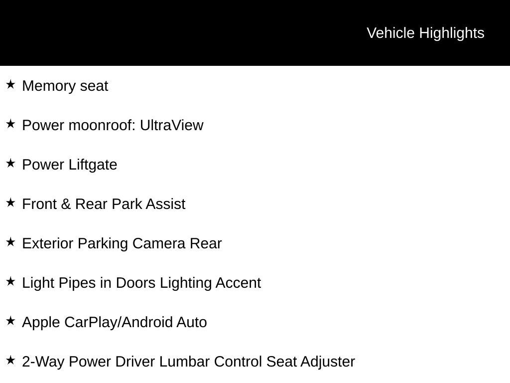 - Sunroof, power UltraView double-sized glass roof that opens over first row, tilt-sliding with Express-Open and power sunshade