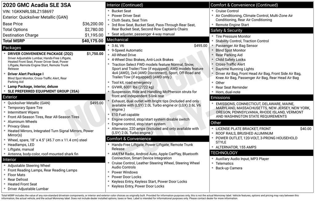** NEW TIRES ** Quicksilver Metallic 2020 GMC Acadia SLE AWD 9-Speed Automatic 3.6L V6 SIDI AWD, Jet Black Cloth, 120-Volt Power Outlet, 3rd row seats: split-bench, 8-Way Power Driver Seat Adjuster, Apple CarPlay/Android Auto, Brushed Aluminum Roof Rails, Driver Convenience Package, Hands Free Power Programmable Liftgate, Heated Driver & Front Passenger Seats, Power Driver Lumbar Control Seat Adjuster, Preferred Equipment Group 3SA, Remote Start, SiriusXM Radio, Wheels: 18 Machined Aluminum w/Dark Accents. COMES WITH A WRITTEN FITZWAY CHECKOUT COVERING ALL MAJOR ITEMS! THE BEST GUARANTEE IN THE ENTIRE COUNTRY! DON'T PAY FOR A MISTAKE SOMEWHERE ELSE! No Added Market Adjustments or Hidden Fees! Transparency You Can Trust, That's The FitzWay! Please visit us at Fitzgerald Used Cars Clearwater between NE Coachman and Sunset Point RD on the north bound service rd. At 23499 US 19 N, Clearwater FL 33765. OR Contact a Sales Associate 727-799-1999. Recent Arrival!