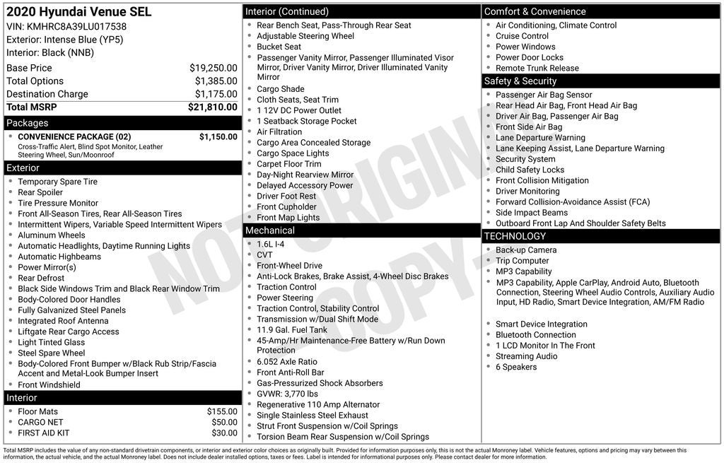 Intense Blue 2020 Hyundai Venue SEL FWD CVT I4 6.5J x 17 Alloy Wheels, Apple CarPlay & Android Auto, Automatic temperature control, Blind Spot Collision Warning (BCW), Convenience Package, Leather Wrapped Shift Knob, Leather Wrapped Steering Wheel, Option Group 02, Power steering, Power Sunroof, Power windows, Radio: AM/FM/HD Display Audio, Sliding Armrest Storage Box.