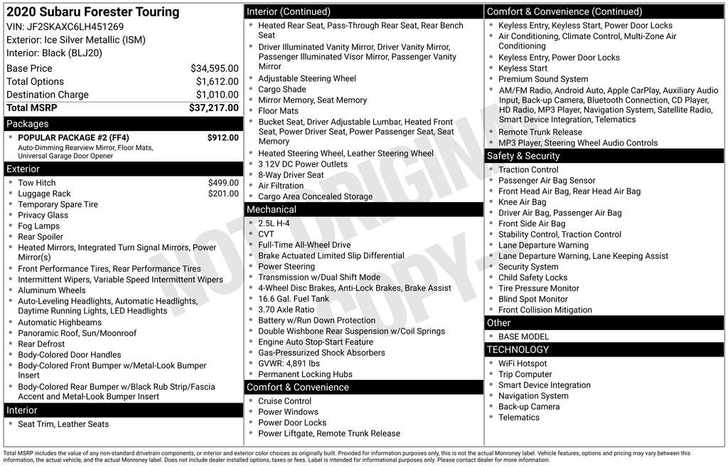 2020 Subaru Forester Ice Silver Metallic Touring AWD Lineartronic CVT 2.5L 4-Cylinder DOHC 16V VVT 9 Speakers, Active Cruise Control, Alloy wheels, AM/FM radio: SiriusXM, Auto High-beam Headlights, Automatic temperature control, CD player, Driver vanity mirror, Exterior Parking Camera Rear, Front anti-roll bar, Front dual zone A/C, harman kardon 576W Amp & Speaker System, Heated Front Bucket Seats, Heated steering wheel, Knee airbag, Leather Shift Knob, Low tire pressure warning, Memory seat, Navigation System, Outside temperature display, Panic alarm, Passenger vanity mirror, Perforated Leather-Trimmed Upholstery, Power Liftgate, Power moonroof: Panoramic, Premium audio system: harman/kardon, Radio: Subaru Starlink 8.0 Multimedia Nav System, Rear anti-roll bar, Rear window defroster, Rear window wiper, Remote keyless entry, Security system, STARLINK/Apple CarPlay/Android Auto, Steering wheel mounted audio controls, Telescoping steering wheel, Tilt steering wheel, Turn signal indicator mirrors, Variably intermittent wipers.