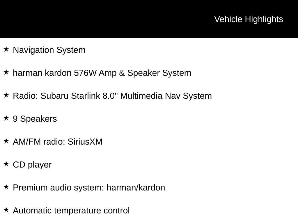 - Radio: Subaru Starlink 8.0" Multimedia Nav System -inc: AM/FM stereo HD Radio w/single-disc CD player w/MP3/WMA/CRR/RW file capability, multi-touch gesture high resolution display, 8.0" LCD screen, voice activated controls, Bluetooth® audio streaming connectivity, hands-free phone connectivity and hands-free SMS text messaging connectivity, Near Field Communication (NFC), iPod control capability, rear-vision camera display, SiriusXM All Access radio, Traffic and Travel Link (subscription required), smartphone integration: AHA, Android Auto, CarPlay and Pandora, Starlink cloud applications: refer to subaru.com for app availability, dual USB input ports, 3.5mm auxiliary input jack and body color roof mounted antenna