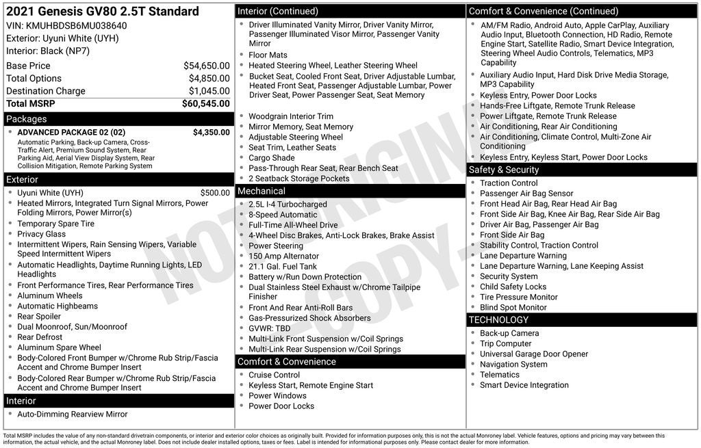 ** ONE OWNER ** NAVIGATION ** MOONROOF ** Uyuni White 2021 Genesis GV80 2.5T AWD 8-Speed Automatic 2.5L DOHC 12 Speakers, Advanced Package 02, Air Conditioning, Android Auto & Apple CarPlay, Auto tilt-away steering wheel, Auto-dimming door mirrors, Auto-dimming Rear-View mirror, Auto-leveling suspension, Blind-Spot View Monitor, Delay-off headlights, Emergency communication system: Genesis Connected Services, Exterior Parking Camera Rear, Front Bucket Seats, Front dual zone A/C, Heated & Ventilated Front Bucket Seats, Leather Seating Surfaces, Leatherette Seating Surfaces, Lexicon Premium Audio w/21-Speakers, Low tire pressure warning, Memory seat, Navigation System, Option Group 02, Outside temperature display, Power driver seat, Power Liftgate, Power moonroof, Radio: AM/FM/SiriusXM/HD Premium Audio System, Rear air conditioning, Rear Parking Collision-Avoidance Assist, Remote Smart Parking Assist, Speed control, Steering wheel memory, Steering wheel mounted audio controls, Surround View Monitor, Turn signal indicator mirrors, Wheels: 20 x 8.5J Alloy. COMES WITH A WRITTEN FITZWAY CHECKOUT COVERING ALL MAJOR ITEMS! THE BEST GUARANTEE IN THE ENTIRE COUNTRY! DON'T PAY FOR A MISTAKE SOMEWHERE ELSE! No Added Market Adjustments or Hidden Fees! Transparency You Can Trust, That's The FitzWay! Please visit us at Fitzgerald Used Cars Clearwater between NE Coachman and Sunset Point RD on the north bound service rd. At 23499 US 19 N, Clearwater FL 33765. OR Contact a Sales Associate 727-799-1999. Recent Arrival!