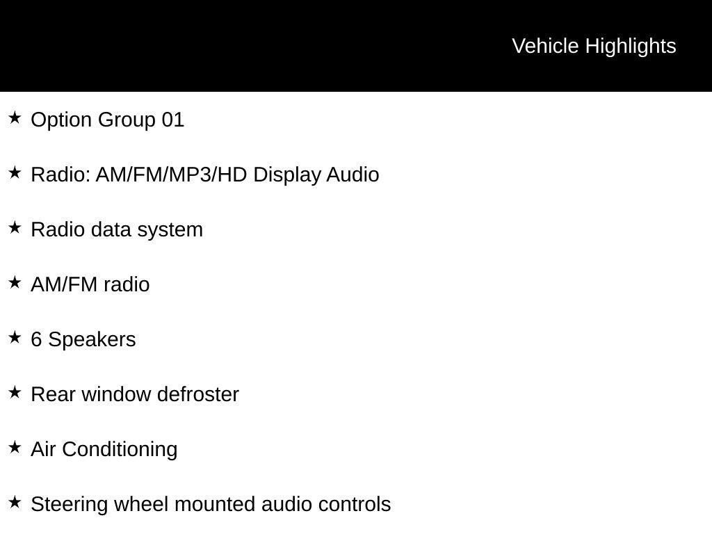 - Radio w/Seek-Scan, Clock, Speed Compensated Volume Control, Steering Wheel Controls, Voice Activation and Radio Data System