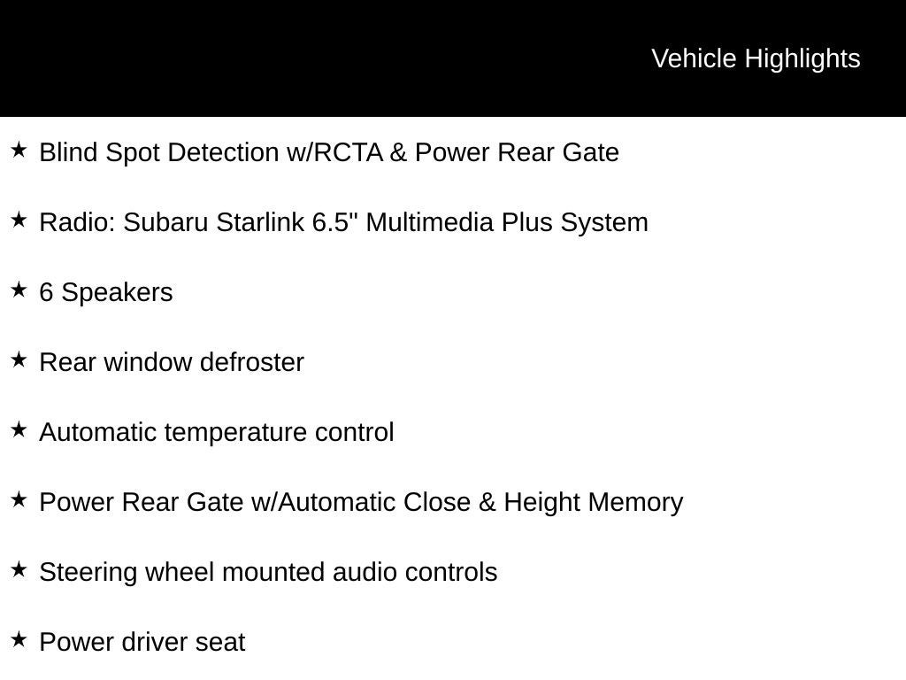 - Radio: Subaru Starlink 6.5" Multimedia Plus System -inc: AM/FM stereo HD Radio w/single-disc CD player w/MP3/WMA/CRR/RW file capability, multi-touch gesture high resolution display, 6.5" LCD screen, voice activated controls, Bluetooth® audio streaming connectivity, hands-free phone connectivity and hands-free SMS text messaging connectivity, iPod control capability, rear-vision camera display, SiriusXM All Access radio (subscription required), smartphone integration: AHA, Android Auto, CarPlay and Pandora, Starlink cloud applications: refer to subaru.com for app availability, 6 speakers, 2 USB input ports, 3.5mm auxiliary input jack and body color roof mounted antenna