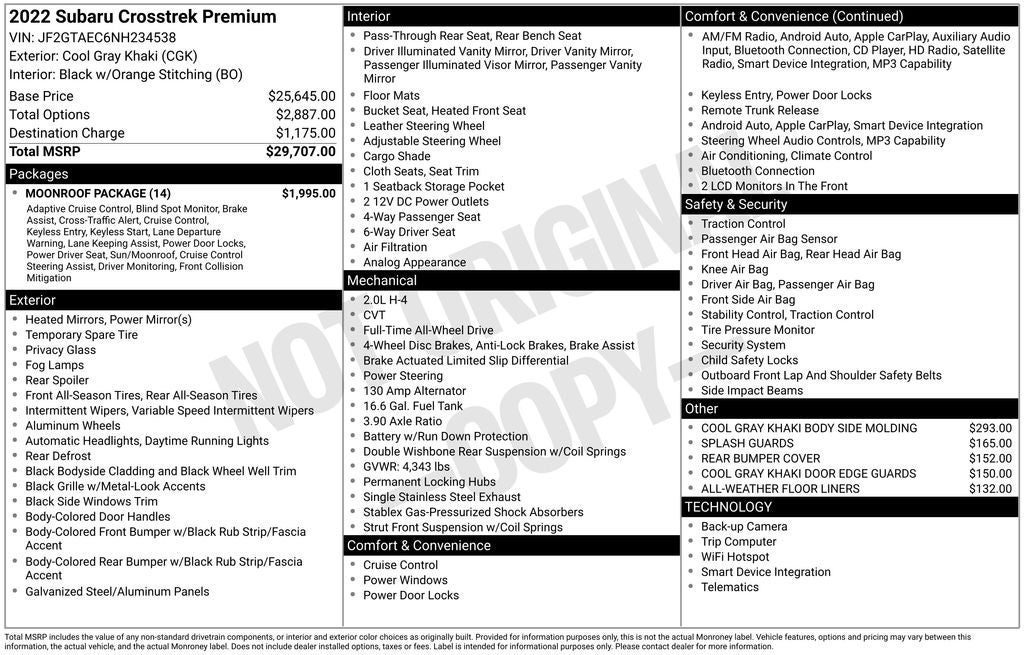** ONE OWNER ** SUNROOF ** 2022 Subaru Crosstrek Cool Gray Khaki Premium AWD Lineartronic CVT 2.0L 4-Cylinder DOHC 16V 6 Speakers, 6-Way Power Driver's Seat, Alloy wheels, AM/FM radio: SiriusXM, Anti-whiplash front head restraints, Automatic temperature control, Blind Spot Detection (BSD), CD player, Cloth Upholstery, Driver vanity mirror, Emergency communication system: STARLINK Safety and Security (Subscription Required), Exterior Parking Camera Rear, EyeSight System, Front anti-roll bar, Heated Front Bucket Seats, Keyless Access w/Push-Button Start, Leather Shift Knob, Low tire pressure warning, Moonroof Package, Outside temperature display, Panic alarm, Passenger vanity mirror, Power Moonroof, Radio: Subaru STARLINK 6.5 Multimedia Plus System, Rear window defroster, Rear window wiper, Remote keyless entry, Security system, Speed control, STARLINK/Apple CarPlay/Android Auto, Steering wheel mounted audio controls, Subaru STARLINK Smartphone Integration, Telescoping steering wheel, Tilt steering wheel, Variably intermittent wipers. Recent Arrival! 28/33 City/Highway MPG