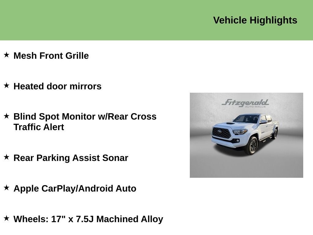 White 2022 Toyota Tacoma TRD Sport V6 RWD 6-Speed Automatic 3.5L V6 PDI DOHC 24V LEV3-ULEV70 278hp 120V/400W Deck Mounted AC Power, Apple CarPlay/Android Auto, Auto High-beam Headlights, Blind Spot Monitor w/Rear Cross Traffic Alert, Color-Keyed Rear Bumper, Engine Immobilizer, Exterior Parking Camera Rear, Heated door mirrors, Mesh Front Grille, Rear Parking Assist Sonar, Smart Key w/Push Button Start, Technology Package, TRD Sport Package, Wheels: 17 x 7.5J Machined Alloy.