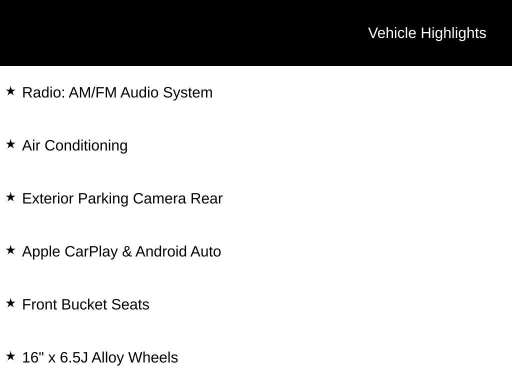 - Radio: AM/FM Audio System -inc: 8" display audio, 6 speakers, Android Auto, Apple CarPlay, supports Siri and Google Now, 1 amp USB data/charge jack and Bluetooth®