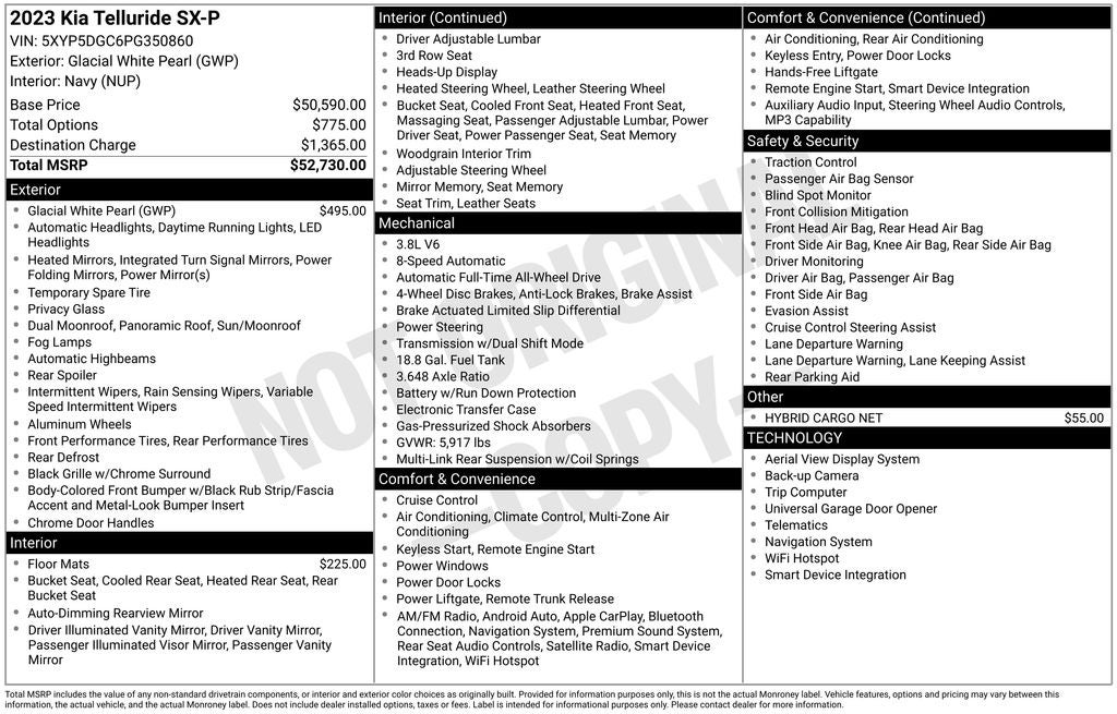 ** ONE OWNER ** Glacial White Pearl 2023 Kia Telluride SX-Prestige AWD 8-Speed Automatic 3.8L V6 DGI DOHC Dual CVVT SUNROOF / MOONROOF, 10 Speakers, 3.648 Axle Ratio, 3rd row seats: split-bench, Air Conditioning, Apple CarPlay & Android Auto, Exterior Parking Camera Rear, Front fog lights, harman/kardon® Speakers, Heads-Up Display, Heated & Ventilated Front Bucket Seats, Heated front seats, Heated rear seats, Memory seat, Navigation System, Passenger door bin, Power driver seat, Power Liftgate, Power moonroof, Power passenger seat, Premium Nappa Leather Seat Trim, Radio: AM/FM harman/kardon Audio System, Rear air conditioning, Roof rack: rails only, Smart Key w/ Push Button and Remote Start, Speed control, Turn signal indicator mirrors, Ventilated rear seats, Wheels: 20 x 7.5 Black Finish.