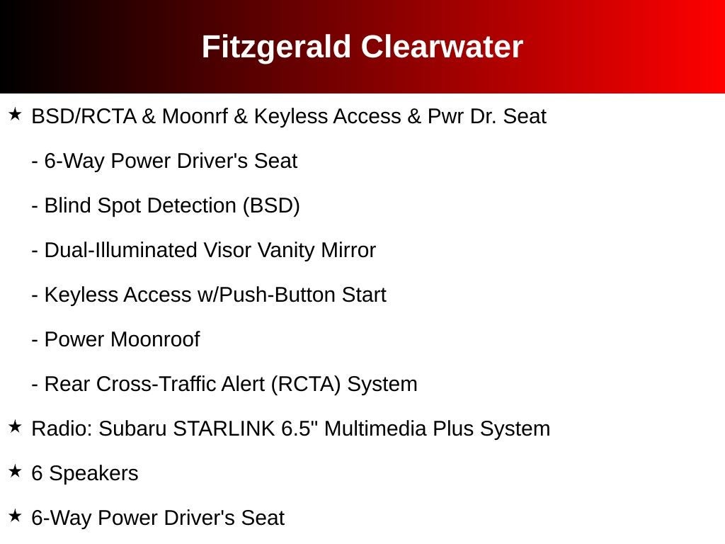 - Radio: Subaru STARLINK 6.5" Multimedia Plus System -inc: AM/FM stereo, HD Radio, single disc CD player w/MP3/WMA/CRR/RW file capability, multi-touch gesture high resolution display screen, voice activated controls, Bluetooth® audio streaming and hands-free phone connectivity, Bluetooth® hands-free SMS text messaging connectivity, iPod control capability, rear-vision camera display, SiriusXM All Access radio (4 months free trial/subscription required after), SiriusXM Travel Link (4 months free trial/subscription required after), smartphone integration: AHA, Android Auto, Apple CarPlay, Pandora, STARLINK cloud applications, 6 speakers, 3.5mm auxiliary input jack, dual USB A input charge ports, roof mounted antenna and audio/satellite connected services
