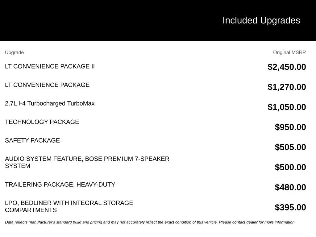 ** ONE OWNER ** Sterling Gray Metallic 2024 Chevrolet Colorado LT RWD 8-Speed Automatic 2.7L I4 Turbocharged DOHC 16V LEV3-ULEV50 237hp 6-Speaker Audio System Feature, 8-Way Power Driver Seat Adjuster, Adaptive Cruise Control, Bose Premium 7-Speaker Audio System Feature, Driver & Front Passenger Illuminated Visors, Dual-Zone Automatic Air Conditioning, Electronic Automatic Cruise Control, EZ-Lift & Lower Tailgate, Front LED Fog Lamps, HD Surround Vision, Heated Driver & Front Passenger Seats, Heated Power-Adjustable Outside Mirrors, Heavy-Duty Trailering Package, Inside Rear-View Auto-Dimming Mirror, Integrated Trailer Brake Controller, LT Convenience Package, LT Convenience Package II, Manual Rear-Sliding Window, Navigation System, Power Driver Lumbar Control Seat Adjuster, Radio: 11.3 Diagonal Advanced Color LCD Display, Rear Cross Traffic Braking, Rear Park Assist, Rear Pedestrian Alert, Rear-Window Electric Defogger, Remote Vehicle Starter System, Safety Package, SiriusXM Radio, Steering Wheel Mounted Audio Controls, Steering wheel mounted audio controls, StowFlex Tailgate Storage Compartment, Tailgate Keyed Cylinder Lock, Technology Package, Tilt & Telescoping Steering Column, Wireless Charging, Wireless Phone Projection.