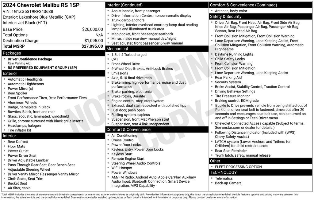 Lakeshore Blue 2024 Chevrolet Malibu RS FWD CVT 1.5L DOHC Jet Black w/Premium Cloth Seat Trim, 18 Aluminum Wheels, 6-Speaker Audio System Feature, 6-Way Manual Front Passenger Seat Adjuster, 8-Way Power Driver Seat Adjuster, Delay-off headlights, Driver vanity mirror, Emergency communication system: OnStar and Chevrolet connected services capable, Exterior Parking Camera Rear, Front Bucket Seats, Low tire pressure warning, Outside temperature display, Power Driver Lumbar Control Seat Adjuster, Power driver seat, Preferred Equipment Group 1SP, Premium audio system: Chevrolet Infotainment 3, Radio: Chevrolet Infotainment 3 System, Remote keyless entry, Speed control, Wireless Apple CarPlay/Android Auto. COMES WITH A WRITTEN FITZWAY CHECKOUT COVERING ALL MAJOR ITEMS! PROTECTED BY THE REMAINING BALANCE OF THE ORIGINAL FACTORY WARRANTY AND OUR 90 DAY/4K MILE COMPREHENSIVE COVERAGE OF ALL MAJOR SYSTEMS AND COMPONENTS. WE OFFER A 10 DAY/500 MILE WRITTEN MONEY BACK GUARANTEE!! 30 DAY/1500 MILE EXCHANGE POLICY!! ALL FITZGERALD PRICES ARE REAL PRICES WITH NO SNEAKY PRICE CONDITIONS OR ADDITIONAL RECONDITIONING OR CERTIFICATION CHARGES! THE BEST GUARANTEE IN THE ENTIRE COUNTRY! DON'T PAY FOR A MISTAKE SOMEWHERE ELSE! Please visit us at Fitzgerald Used Cars Clearwater between NE Coachman and Sunset Point RD on the north bound service rd. At 23499 US 19 N, Clearwater FL 33765. OR Contact a Sales Associate 727-799-1999. Transparency You Can Trust. That's the Fitzway! Recent Arrival! 28/36 City/Highway MPG