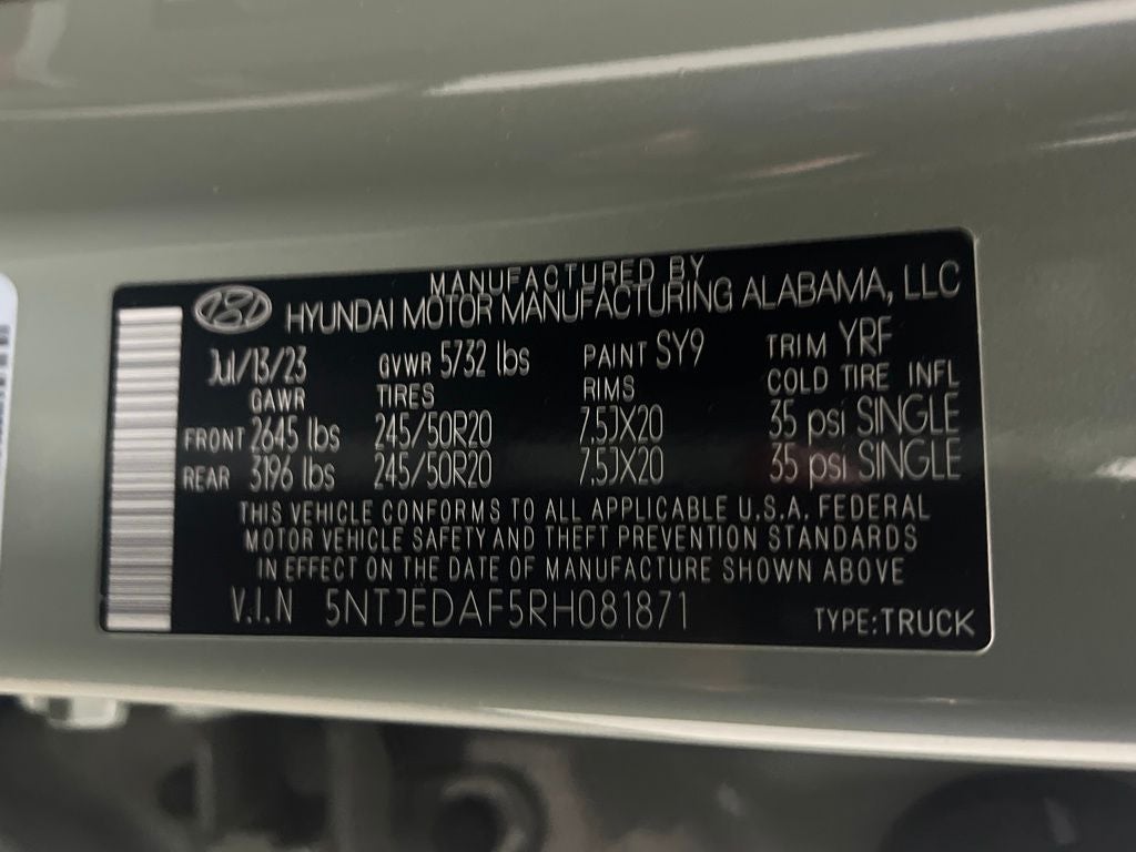 2024 Hyundai Santa Cruz Dark Green Limited AWD Shiftronic 2.5L I4 3.316 Axle Ratio, 4-Wheel Disc Brakes, 8 Speakers, ABS brakes, Air Conditioning, Alloy wheels, AM/FM radio: SiriusXM, Apple CarPlay & Android Auto, Auto High-beam Headlights, Auto-dimming Rear-View mirror, Auto-leveling suspension, Automatic temperature control, Bed Cargo Net, Brake assist, Bumpers: body-color, Carpeted Floor Mats, Delay-off headlights, Driver door bin, Driver vanity mirror, Dual front impact airbags, Dual front side impact airbags, Electronic Stability Control, Emergency communication system: Bluelink+, Envelope Cargo Net, Exterior Parking Camera Rear, Four wheel independent suspension, Front anti-roll bar, Front Bucket Seats, Front Center Armrest, Front dual zone A/C, Front reading lights, Fully automatic headlights, Garage door transmitter: HomeLink, Heated & Ventilated Front Bucket Seats, Heated door mirrors, Heated front seats, Heated steering wheel, Illuminated entry, Leather Shift Knob, Leather steering wheel, Leather-Trimmed Seats, Low tire pressure warning, Navigation System, Occupant sensing airbag, Option Group 01, Outside temperature display, Overhead airbag, Overhead console, Panic alarm, Passenger door bin, Passenger vanity mirror, Power door mirrors, Power driver seat, Power moonroof, Power steering, Power windows, Radio data system, Radio: AM/FM/HD w/Bose Premium Audio System, Rain sensing wipers, Rear anti-roll bar, Rear side impact airbag, Rear step bumper, Rear window defroster, Remote keyless entry, Roadside Assistance Kit, Security system, Speed control, Speed-sensing steering, Split folding rear seat, Spoiler, Steering wheel mounted audio controls, Tachometer, Telescoping steering wheel, Tilt steering wheel, Traction control, Trip computer, Turn signal indicator mirrors, Variably intermittent wipers, Ventilated front seats, Wheels: 20 x 7.5J Alloy.