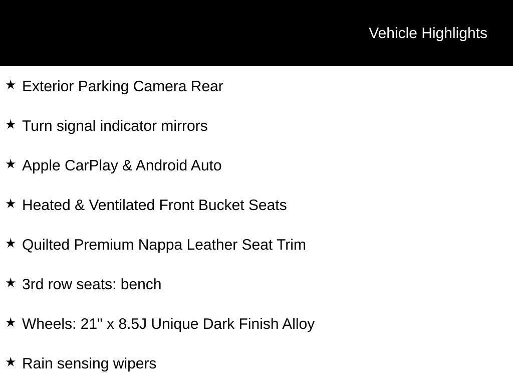 - Wheels: 21" x 8.5J Unique Dark Finish Alloy