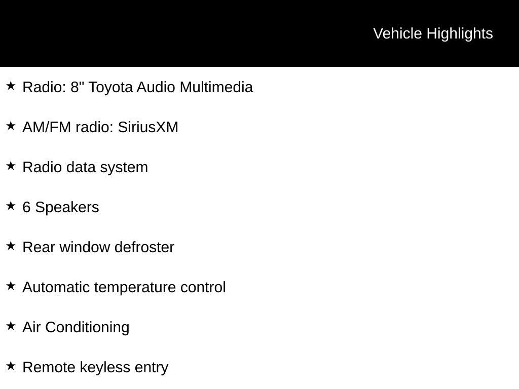 - Radio: 8" Toyota Audio Multimedia -inc: 6 speakers, wireless Apple CarPlay and Android Auto compatibility and SiriusXM w/3-month Platinum Plan trial subscription, See toyota.com/connected-services for details