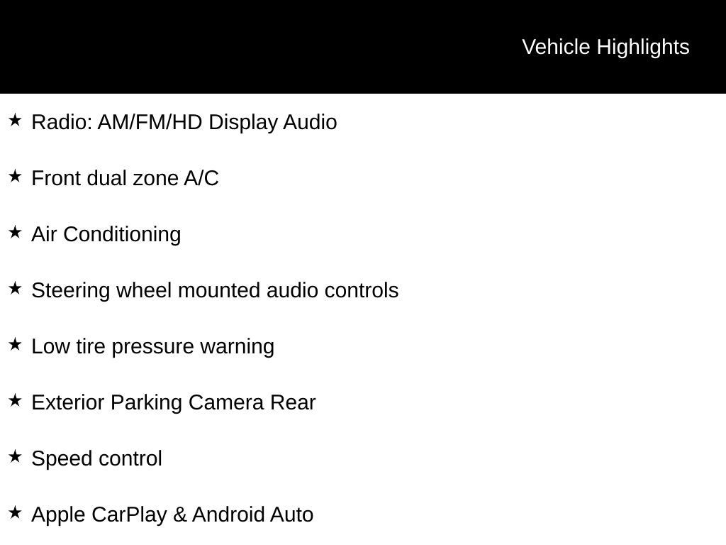 - Radio: AM/FM/HD Display Audio -inc: 8" display, 6 speakers, high resolution touchscreen, wireless Apple CarPlay and Android Auto, Bluetooth® hands-free phone system w/voice recognition, dual USB ports and speed-sensitive automatic volume control
