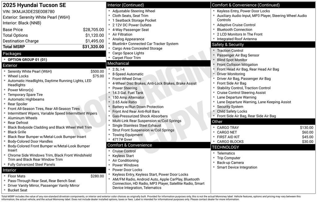** HYUNDAI CERTIFIED ** 2025 Hyundai Tucson Serenity White Pearl SE FWD 8-Speed Automatic with SHIFTRONIC 2.5L I4 DGI DOHC 16V LEV3-SULEV30 187hp 17 Alloy Wheels, Air Conditioning, Apple CarPlay & Android Auto, Delay-off headlights, Emergency communication system: Bluelink+, Front Bucket Seats, Low tire pressure warning, Radio data system, Radio: AM/FM/HD Audio System, Remote keyless entry, Speed control, Stain & Odor Resistant Cloth Seat Trim, Steering wheel mounted audio controls. Recent Arrival! 25/33 City/Highway MPG ** Hyundai Certified Used Vehicles Details: * Powertrain Limited Warranty: 120 Month/100,000 Mile (whichever comes first) from original in-service date