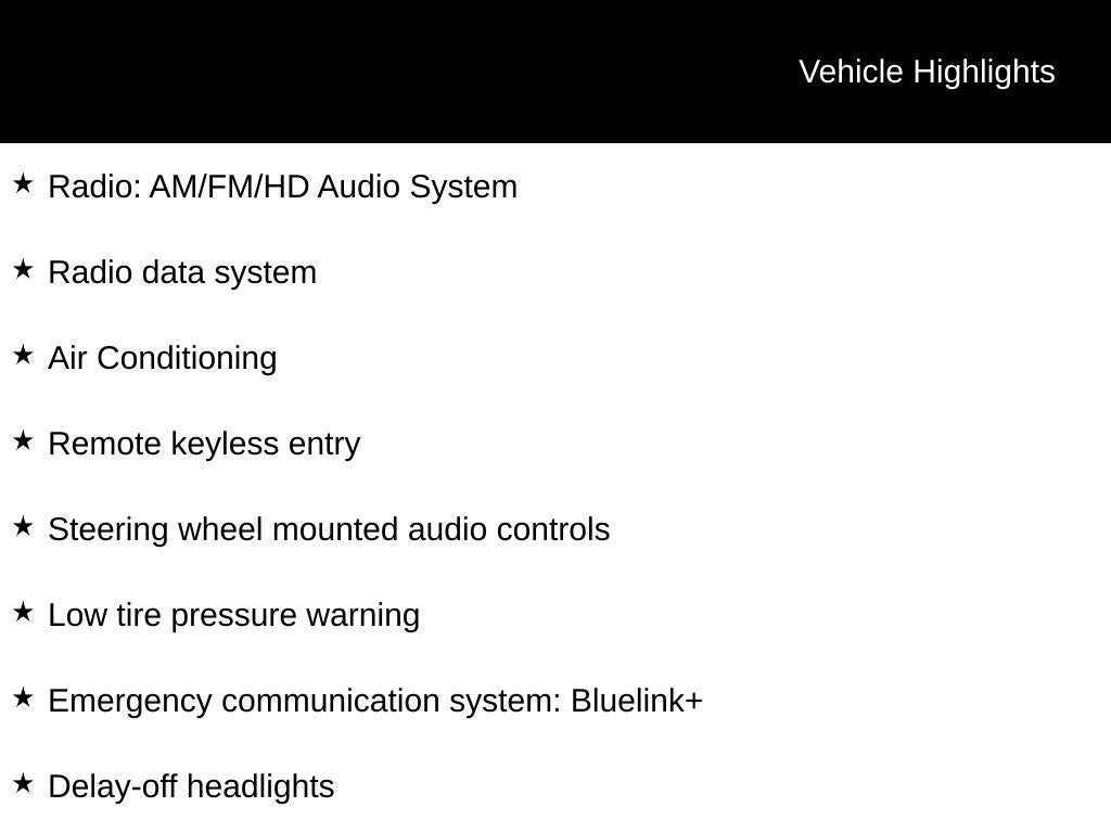 - Radio: AM/FM/HD Audio System -inc: 12.3" color touchscreen display, 6 speakers, SiriusXM satellite radio system (3-month trial subscription), wireless Apple CarPlay and Android Auto integration, controller OTA update capability, Blue Link connected car system and USB connectivity