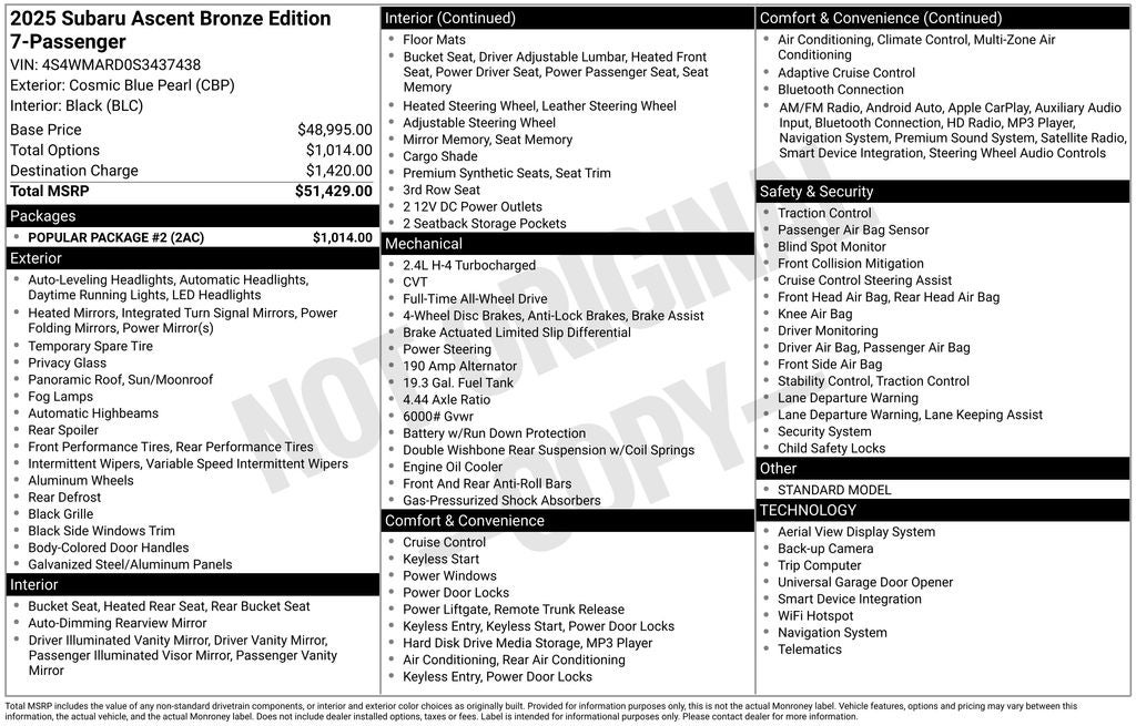 2025 Subaru Ascent Cosmic Blue Pearl Limited Bronze Edition AWD Lineartronic CVT 2.4L 4-Cylinder DOHC 16V 14 Speakers, Active Cruise Control, All-Weather Floor Liners, Alloy wheels, AM/FM radio: SiriusXM with 360L, Apple CarPlay & Android Auto, Auto High-beam Headlights, Auto-dimming Rear-View mirror, Automatic temperature control, Cargo Tray, Compass, Driver vanity mirror, Exterior Parking Camera Rear, Front dual zone A/C, Front fog lights, Fully automatic headlights, Garage door transmitter: HomeLink, Heated Front Bucket Seats, Heated steering wheel, Leather Shift Knob, Leather steering wheel, Low tire pressure warning, Navigation System, Outside temperature display, Panic alarm, Passenger vanity mirror, Power Liftgate, Power moonroof, Power steering, Power windows, Radio: Subaru 11.6 Multimedia System w/Navigation, Rear air conditioning, Rear anti-roll bar, Rear window defroster, Rear window wiper, Reclining 3rd row seat, Remote keyless entry, Security system, StarTex Upholstery, Steering wheel mounted audio controls, Telescoping steering wheel, Tilt steering wheel, Turn signal indicator mirrors, Variably intermittent wipers.