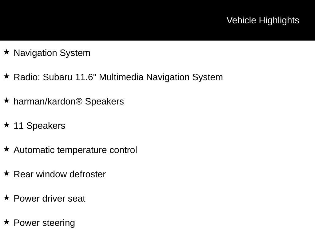 - Radio: Subaru 11.6" Multimedia Navigation System -inc: valet mode, integrated center information display, AM/FM stereo HD Radio, multi-touch gesture high resolution display screen, voice activated controls, voice activated navigation, Bluetooth® audio streaming and hands-free phone connectivity w/SMS text messaging connectivity (refer to subaru.com for cell phone compatibility), TomTom navigation software w/What3Words, iPod control capability, SiriusXM w/360L (4 months free trial/subscription required after), SiriusXM Travel Link (3 years free trial/subscription required after), SiriusXM Live Traffic (1 year free trial/subscription required after), smartphone integration for Android Auto and Apple CarPlay w/full screen view and wireless connection, USB and Over The Air (OTA) audio system update, TomTom navigation system update w/USB/Map Over The Air (MOTA) (3 years free map updates), steering wheel control switches for audio and Bluetooth®, harman/kardon speaker system w/11 speakers and 576 watt equivalent maximum output amplifier, 3.5mm auxiliary input jack and roof mounted audio and satellite antenna